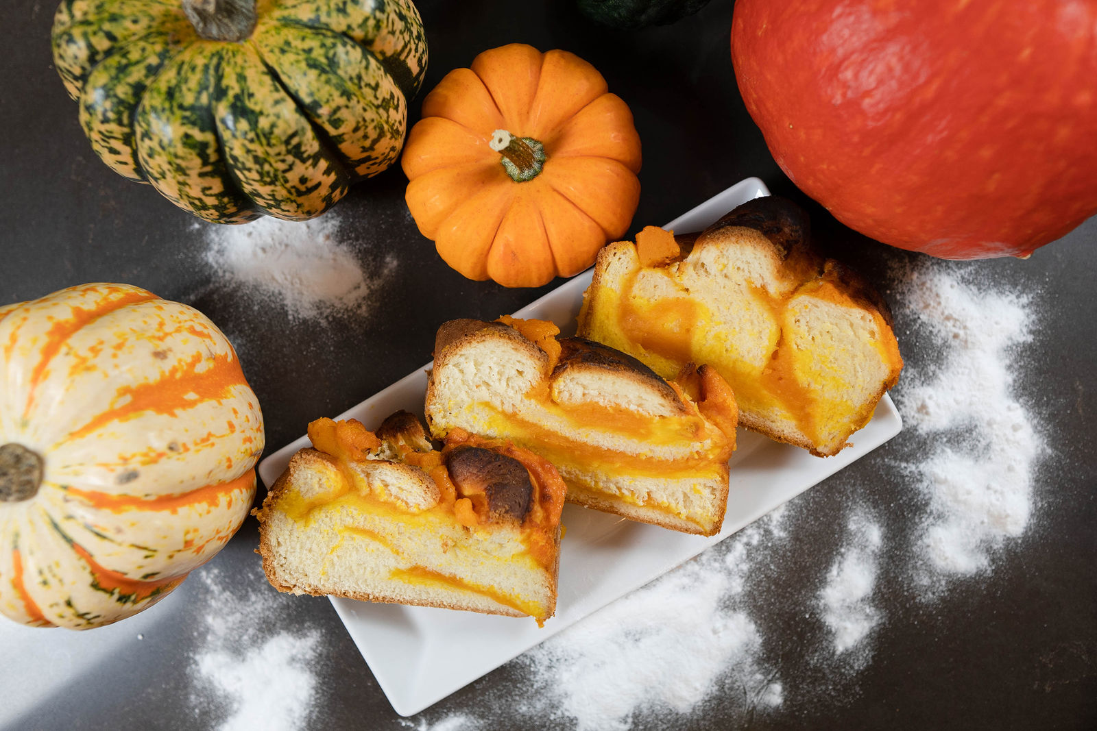 - Den Hefeteig aus der Schüssel nehmen und mit dem Wallholz zu einem Quadrat formen (ca. 35x35cm). Kürbiscreme flach auf dem Teig verteilen. Tipp: Bei den Rändern etwas weniger Creme verteilen, sonst läuft zu fest raus. Teig eng zu einer Rolle formen und längs halbieren. Die beiden Stränge an einem Ende zusammendrücken, umeinanderwickeln und die anderen Enden ebenfalls zusammendrücken. Der geformte Zopf nun in eine gefettete und mit Mehl bestäubte Kastenform geben. Nochmals 10 Minuten gehen lassen.