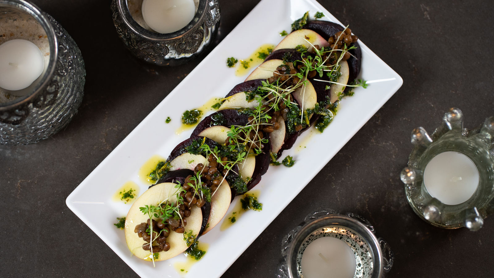 Linsen nach Bedarf nachwürzen. Mit Kresse, Randen- und Apfelscheiben auf einer Platte anrichten. Mit Fleur de sel bestreuen und mit dem Zitronen-Minz-Öl beträufeln.